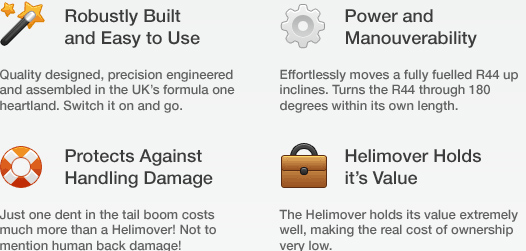 The Helimover™ is an electric tug / tow cart / trolley designed for Robinson R22, R44 and R66 helicopters. It provides a simple and economic means of ground handling for Robinson helicopter owners and operators.